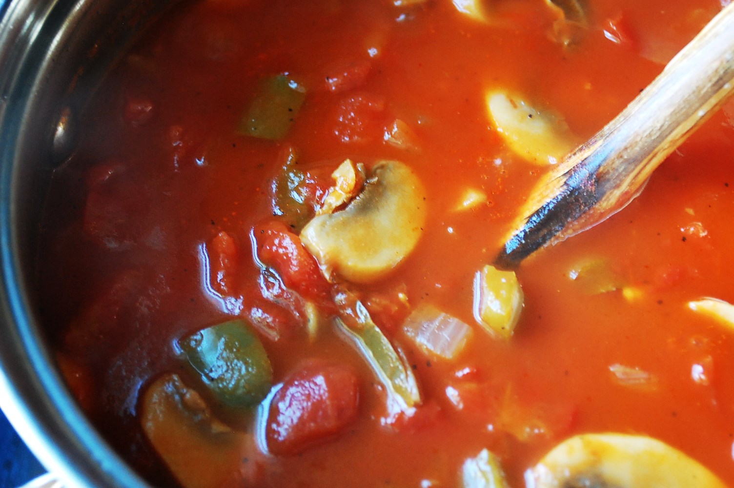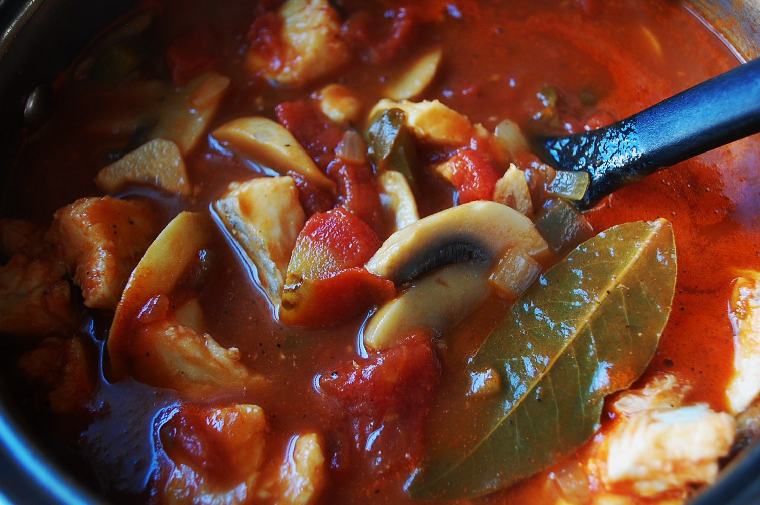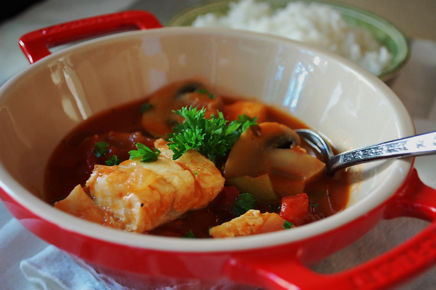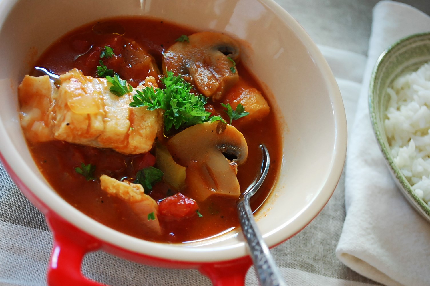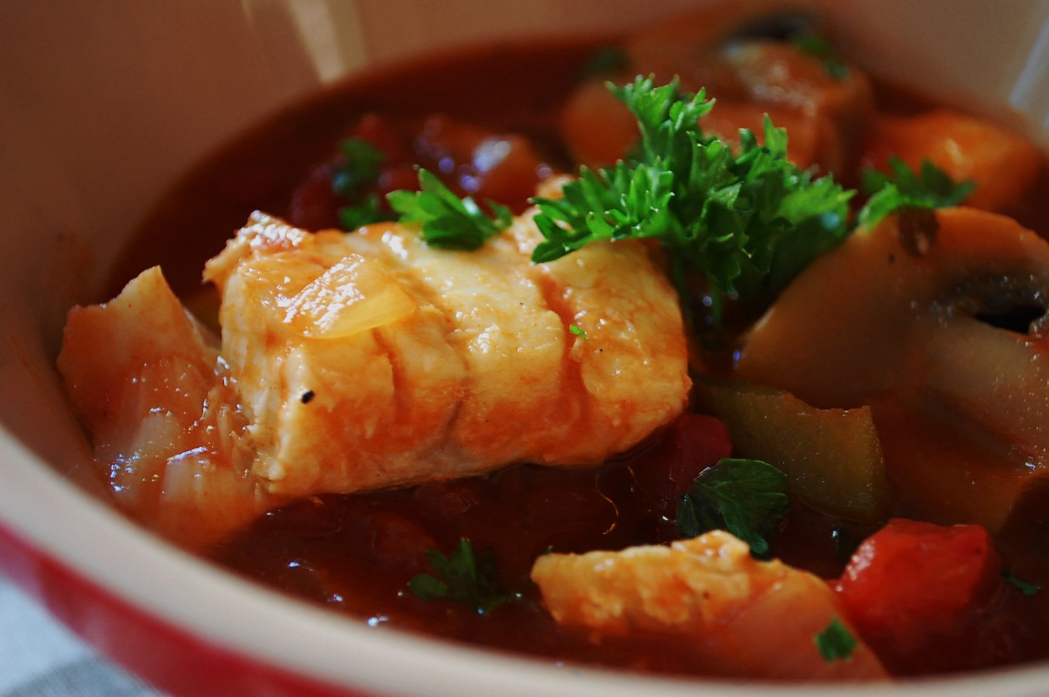 I certainly can’t vouch for the authenticity of this recipe, especially since San Francisco is a fresh seafood mecca and I have altered some ingredients and amounts from the recipe from the book. But I can tell you there is an addicting acidity to the tomato-rich broth, that the fish remains mild and tender, that homemade broth turns the nutritional ante way up, and the slices of pepper and mushrooms are just the perfect vegetable additions to this light soup.