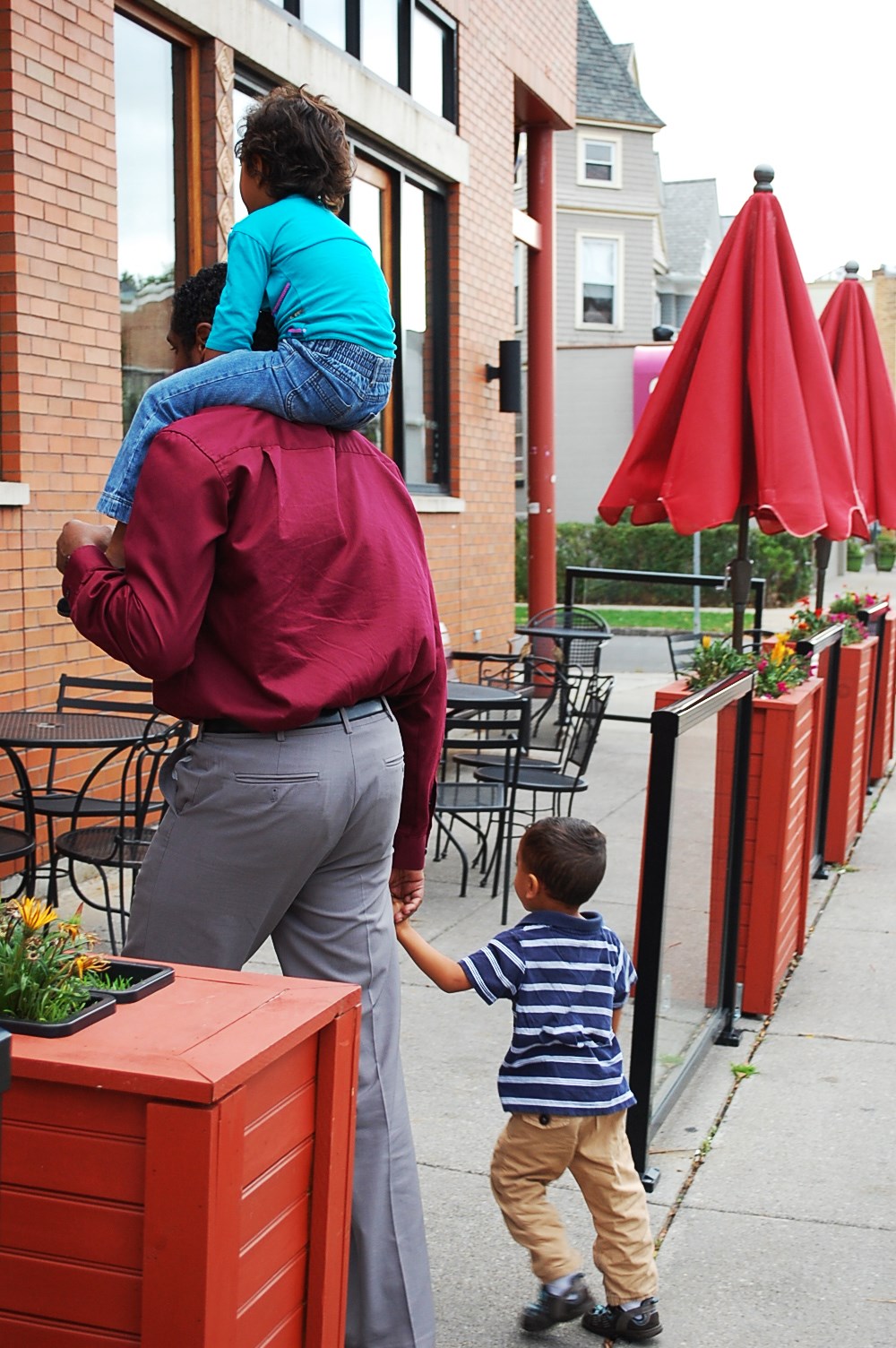 Once I turn over, my tiny two-year-old wraps his skinny arms around my neck, kisses my face and murmurs quietly but excitedly about how he wants chocolate chip pancakes for breakfast. Soon all three of us are up and Paul is stepping into the shower while Elliot, just in a diaper and socks, cuddles with me. Eden wakes up and beats Elliot into the shower with Daddy. I begin to prepare Paul a breakfast to go, of 2 Trim Healthy pancakes, Greek yogurt mixed with a splash of cream and truvia, and our own hand-picked frozen blueberries. One after another, my two mocha children shiver out of the bathroom, cloaked in white towels, dark hair slick against their heads. I break to dress Elliot and instruct Eden to dress in the clothes we left neatly folded on her rocking chair last night.